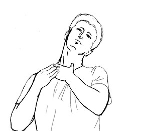 Place a hand on the front-lateral aspect of the neck. Put the other hand on top to reinforce. Then, pull the skin of the neck down toward the collar bone by moving hands down. Use the weight of the arms to pull.